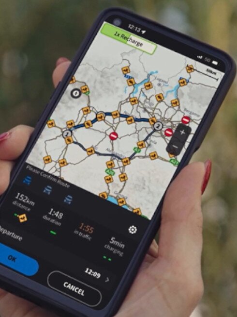 Sie bietet präzise Prognosen zur Reichweite, benötigten Ladevorgängen und Ankunftszeit anhand von Fahrzeugdaten und Fahrstil.