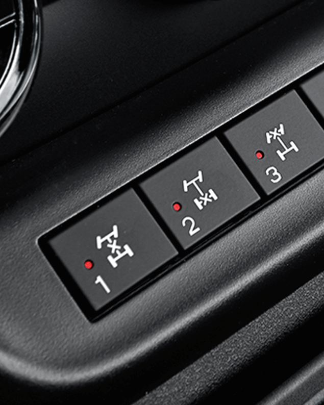 So erreicht er eine beeindruckende Kletterfähigkeit bei durchgängig höchstem Komfort. Die Geländeuntersetzung schalten Sie einfach mit einer ergonomischen Taste am Armaturenbrett zu.