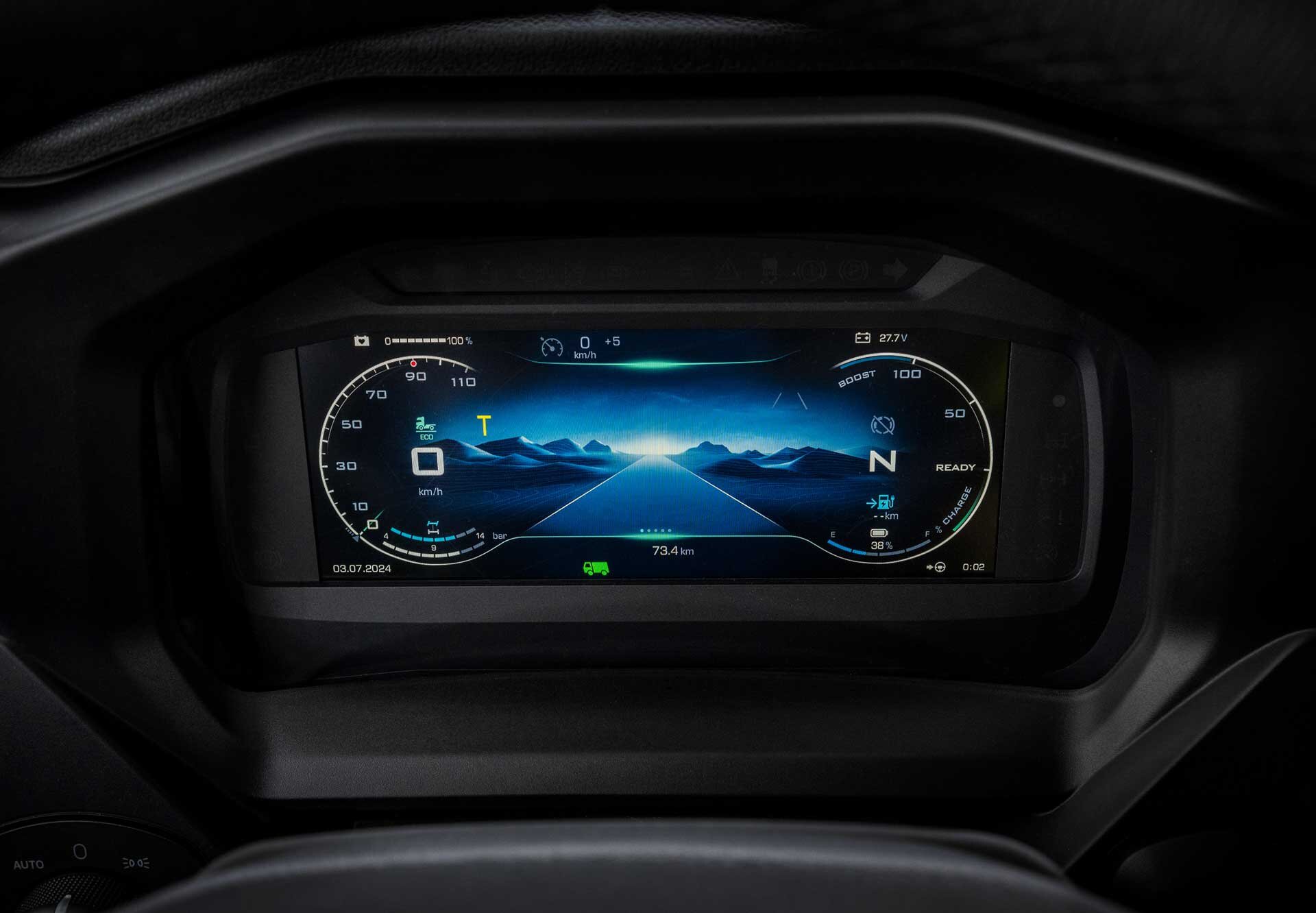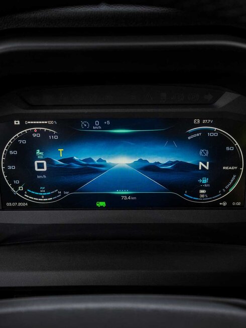 Das digitale Cluster liefert alle üblichen Fahrzeuginformationen zusammen mit den Informationen, die für eine optimale Energienutzung eines Elektrofahrzeugs erforderlich sind, wie z. B. den Ladezustand der Batterie, den Leistungsfluss und die prognostizierte Reichweite. Zusätzlich wird der Status der Zapfwelle angezeigt.