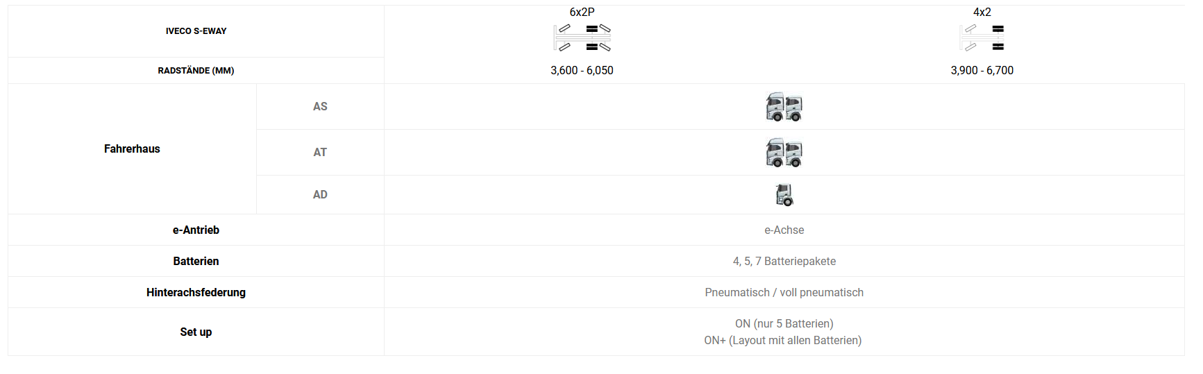 Wählen Sie aus der großen Auswahl an Radständen, Fahrerhäusern, Federungen und Batteriekonfigurationen das Fahrzeug, das Ihren Anforderungen an Null-Emissionen entspricht.